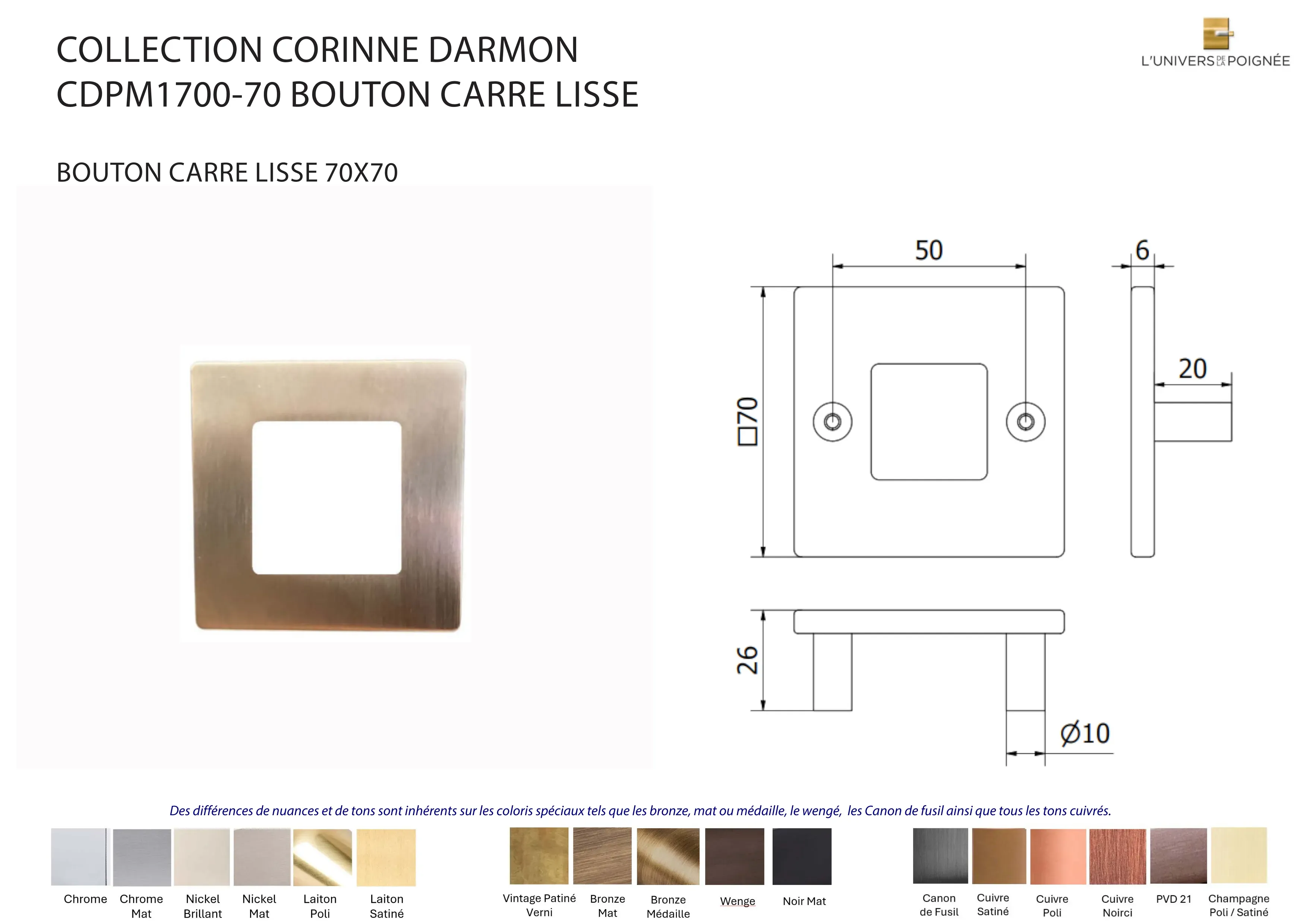 Bouton de meuble CD carré lisse 70x70mm