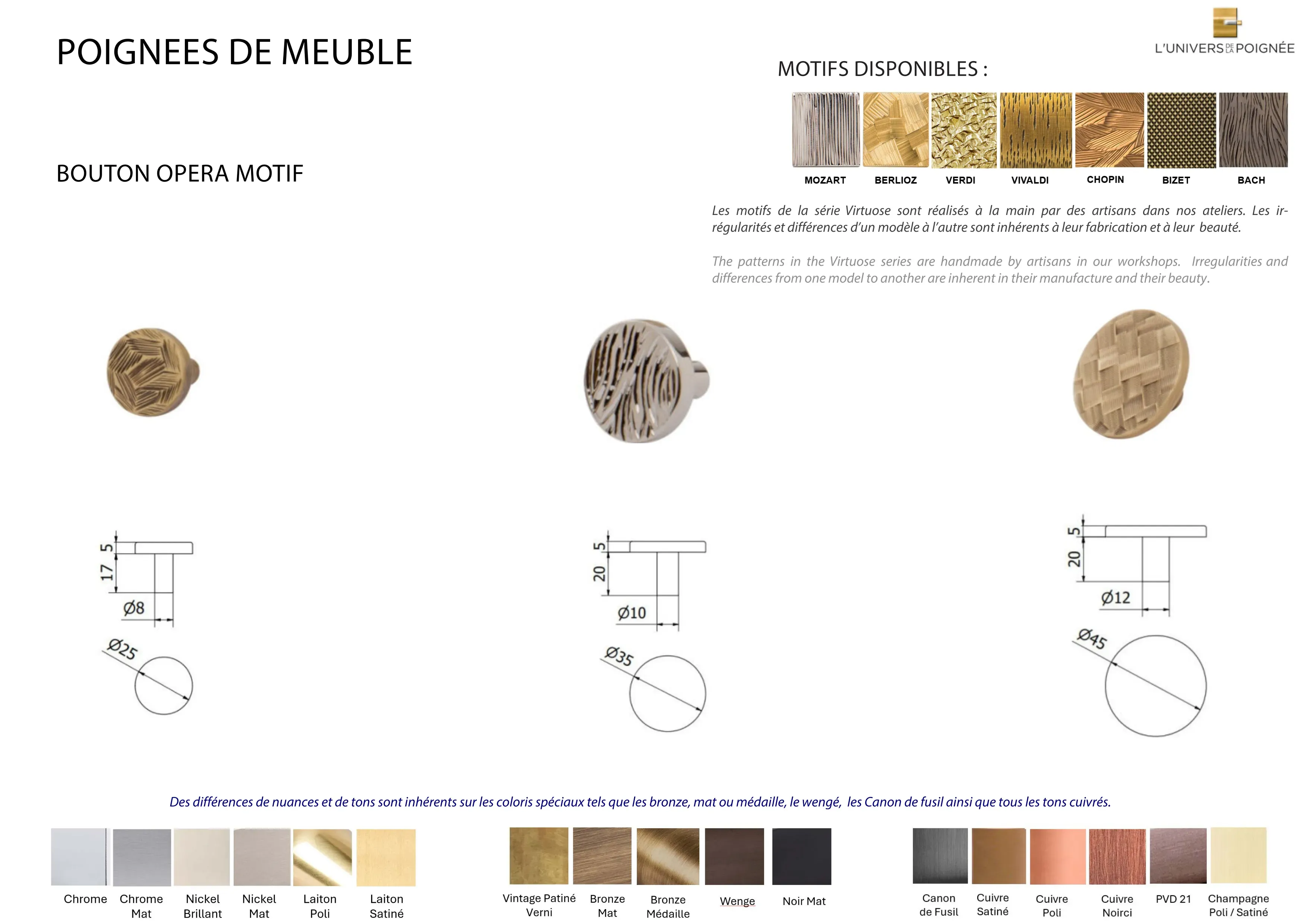 Parce que chaque intérieur mérite une finition sur mesure, le bouton de meuble Opéra est disponible en plus de 15 coloris différents, parmi lesquels : Laiton satiné ; Laiton poli ; Chrome mat ; Chrome brillant ; Nickel mat ; Nickel brillant ; Bronze mat ; Bronze médaille ; Bronze vintage ; Wengé ; Blanc ; Noir mat ; Canon de fusil ; Cuivre satiné ; Cuivre brillant ; Cuivre noirci ; Champagne mat ; Champagne brillant