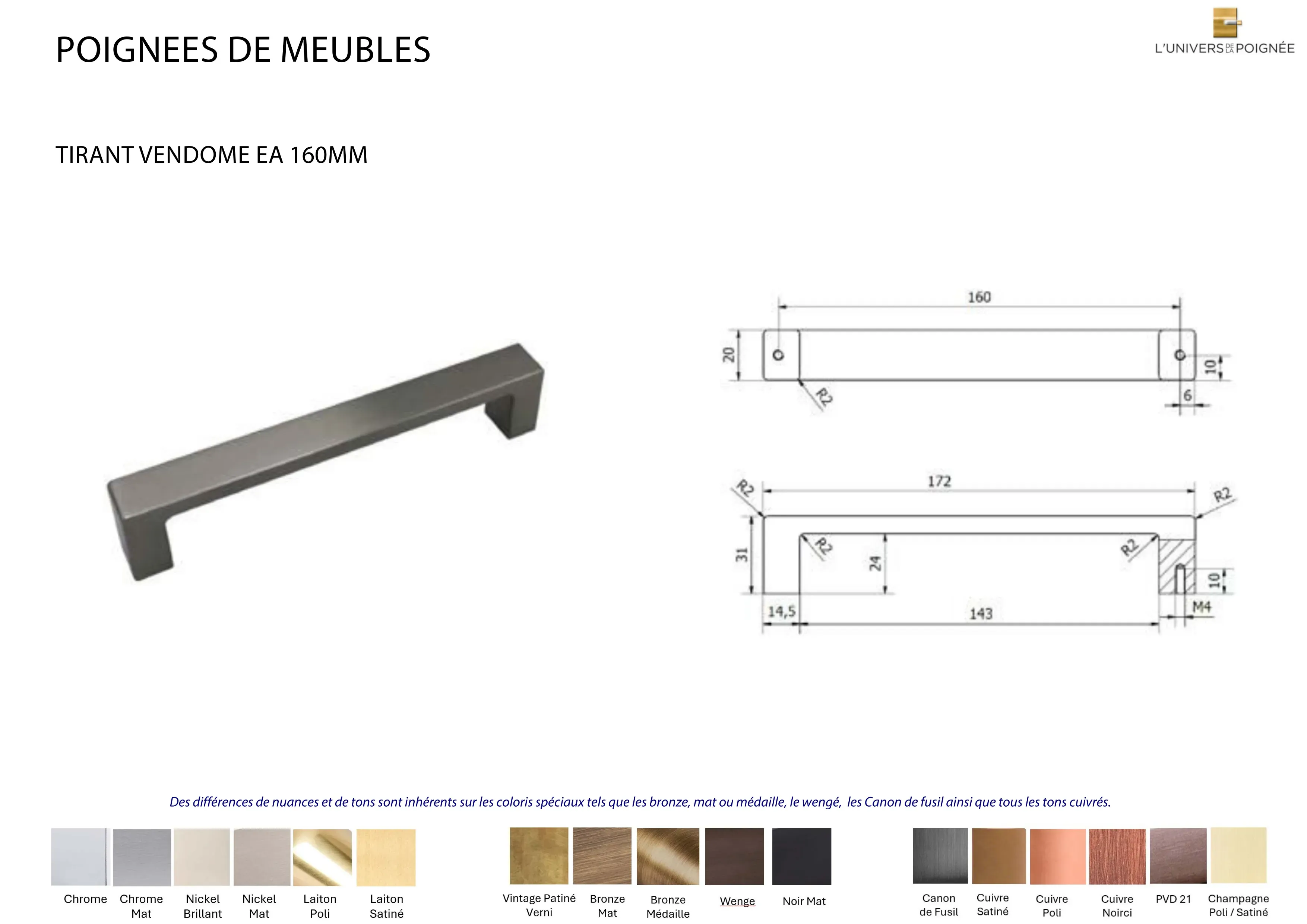 Des différences de nuances et de tons sont inhérents sur les coloris spéciaux tels que les bronze, mat ou médaille, le Wengé, les Canon de fusil ainsi que tous les tons cuivrés.